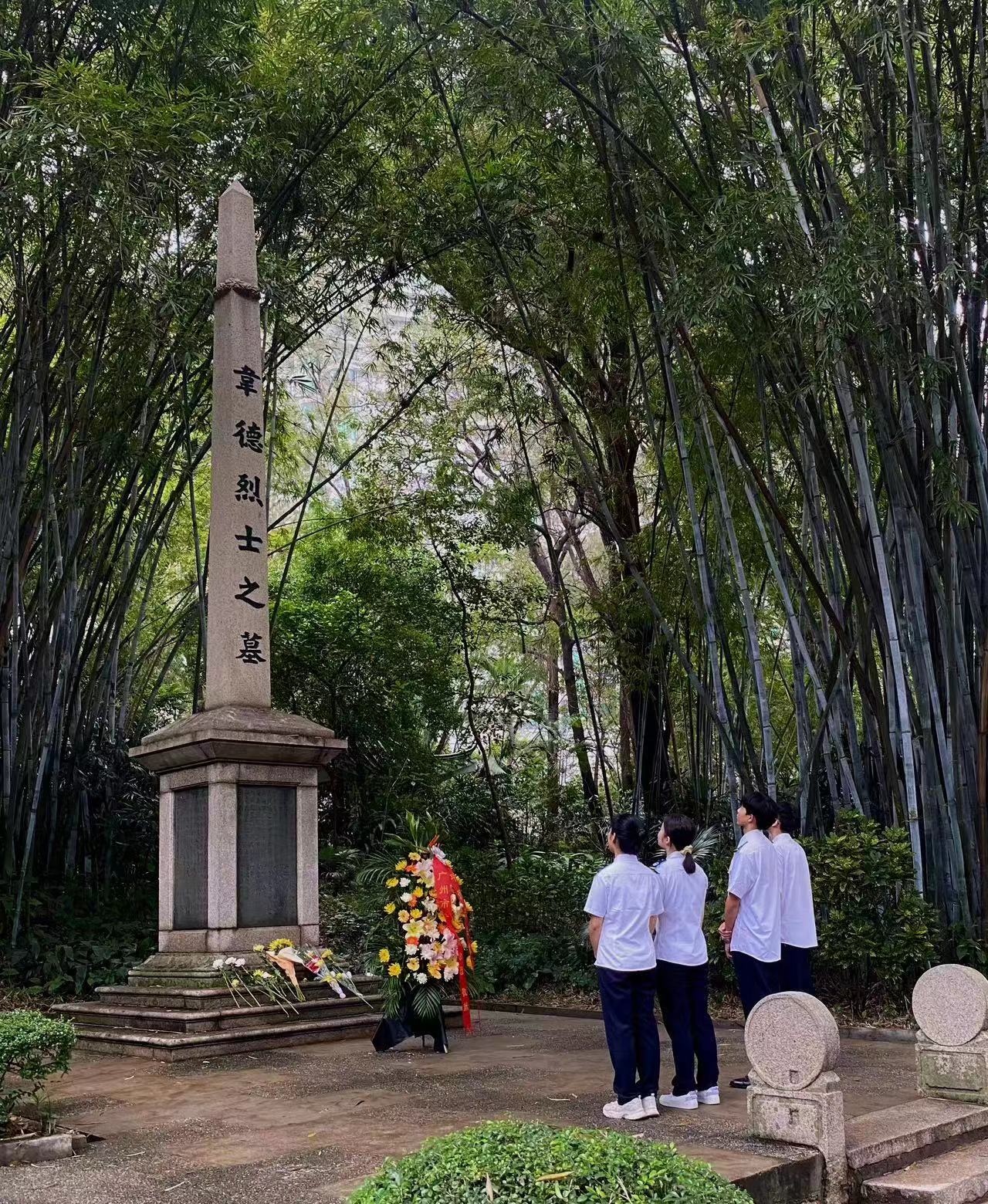 墓园内布局庄严宏伟,烘托出庄严肃穆的气氛,一座座陵墓威严矗立,一股强烈的爱国热情油然而生。主墓道上,烈士墓上的刻字在阳光的照射下闪着金灿的光芒,耀眼的光辉向我们热烈地诉说着那段峥嵘岁月。庄严肃穆的七十二烈士之墓前,同学们满怀对革命先烈无比敬仰与无限哀思之情,瞻仰着一座座烈士墓,并以鲜花寄托对革命先辈的深切缅怀。