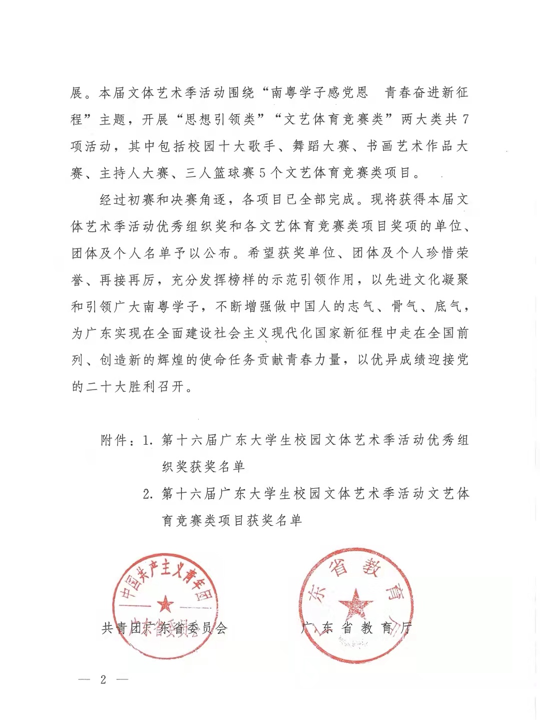 本届文体艺术季活动很好的展现了明胜m88官网学生的青春文化力量,明胜m88官网学生积极参与,取得了良好的成绩。希望获奖队伍及个人珍惜荣誉、再接再厉,充分发挥榜样的示范引领作用,以先进文化凝聚和引领明胜m88官网学生。不断增强志气、骨气、底气,为广东实现在全面建设社会主义现代化国家新征程中走在全国前列、创造新的辉煌的使命任务贡献青春力量。