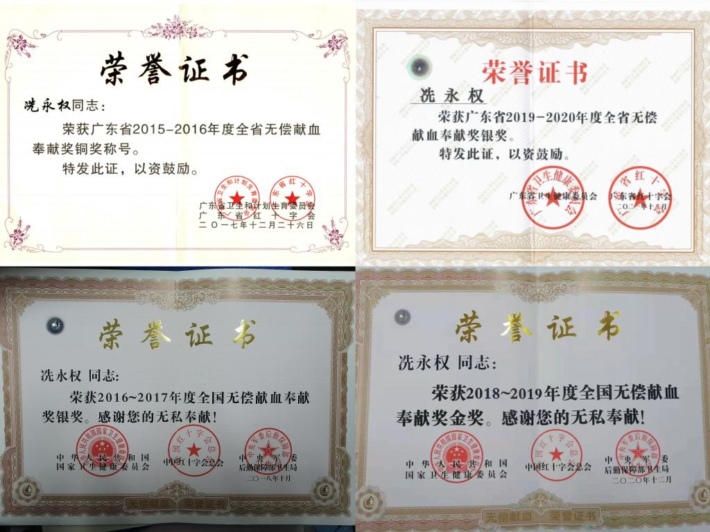 尤为值得一提的是,冼老师作为一名党员,始终践行“全心全意为人民服务”的宗旨,自2008年起连续16年参与无偿献血,累计献血次数达53次,总量超过10600毫升。他的无私奉献赢得了广泛赞誉,先后被授予海南省大学生无偿献血贡献奖、广东省无偿献血奉献奖铜奖与银奖,以及全国无偿献血奉献奖银奖和金奖,成为了一名志愿服务的优秀青年教师。