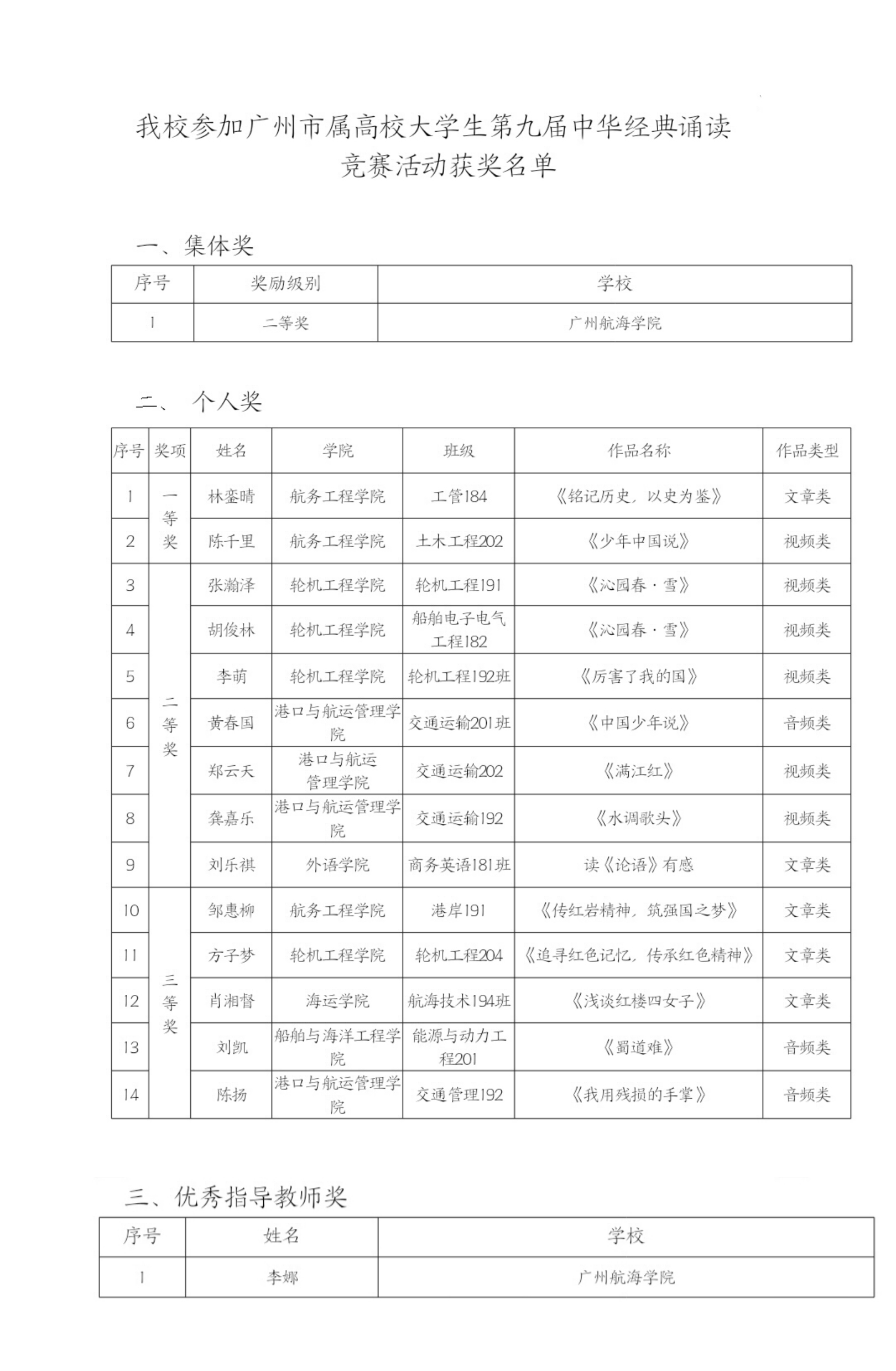 广州市属高校大学生第九届中华经典诵读竞赛活动获奖名单