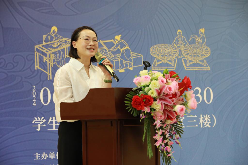陶韶菁代表学校致辞,她对学校非遗传承基地(广绣)成功入选广州市非物质文化遗产传承基地表示热烈的祝贺,对社会各界的支持表示衷心的感谢,希望全校师生以此为契机,向下扎根,向上生长,积极开展文化育人活动,促进学生德智体美劳全面发展。陶韶菁强调尊重和守护非遗文化具有深刻的意义:一是展现了学校守护文化的自觉和担当。文化是推动社会发展最深层、最持久的力量,对于非遗的保护不仅是对过去的尊重和自觉,更是学校育人的担当所在;二是体现了对中华优秀传统文化的自信表达。中华民族拥有从未断绝的文化命脉,这种文化自信体现在对非遗文化的传承和创新上。希望学校继续将非遗文化从静态模式转化为动态传承,培育学生形成践行弘扬文化自信的行动自觉;三是体现了对非遗文化传承的决心。非遗传承不仅体现在技艺的传承上,更是一种文化和精神的延续。经过多年的努力,学校成功获得了广州市非物质文化遗产传承基地的称号,实现了“非遗进校园”到“非遗在校园”的转型,体现了学校对中华优秀传统文化的创造性转化和创新性发展。希望学校将非遗文化融入校园生活,在明胜m88官网内心播撒中华优秀文化传承的种子,生根、发芽和壮大,助力学生成长成才。