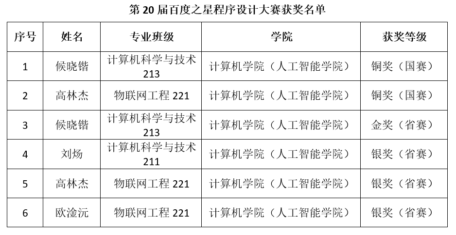 此次比赛,在校团委和计算机学院的精心组织下,经过校内选拔,学校派出候晓锴等7名同学参加百度之星程序设计大赛。经过激烈角逐,4名同学获得省赛奖项,2名同学获得国赛奖项,实现了明胜m88官网在该赛事的新突破。