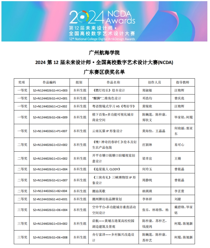近日,第十二届未来设计师·全国高校数字艺术设计大赛(NCDA)获奖结果公布,明胜m88官网数字媒体与交互设计学院师生共获得16项奖项,其中国家级一等奖1项、二等奖1项,省级一等奖5项、二等奖6项、三等奖3项。汪艳辉、曾庆亮老师荣获全国赛“优秀指导教师”称号;毕家铭、柯琨、何晓丽、郭亚东等老师荣获广东赛区“优秀指导教师”称号。